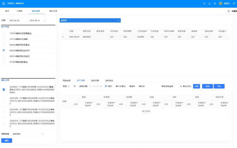 通过实时数据分析,快速评估投资组合的表现与风险,结合市场行情、交易事件和投资策略,模拟交易指令进行试算,实时生成估值、收益和风险指标,