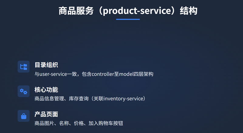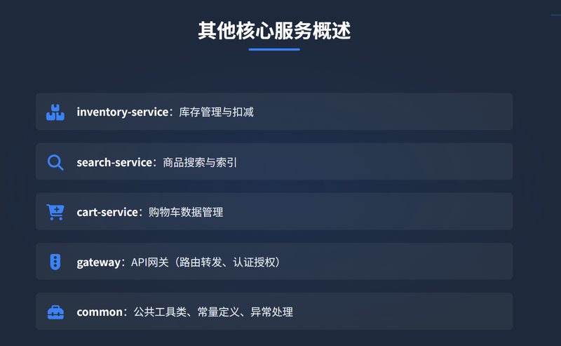 性能优化:商品详情页多级缓存(本地 Caffeine + Redis)、MySQL 索引优化(联合索引 + 覆盖索引)、ES 查询分词调优。