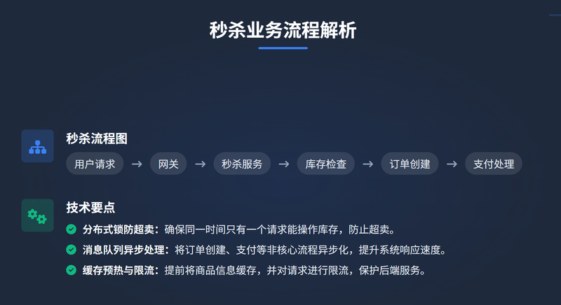 高并发设计:秒杀场景用 Redis 预减库存 + 消息队列异步落库,防止超卖;接口层用 Sentinel 限流,数据库加行锁优化。