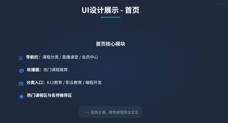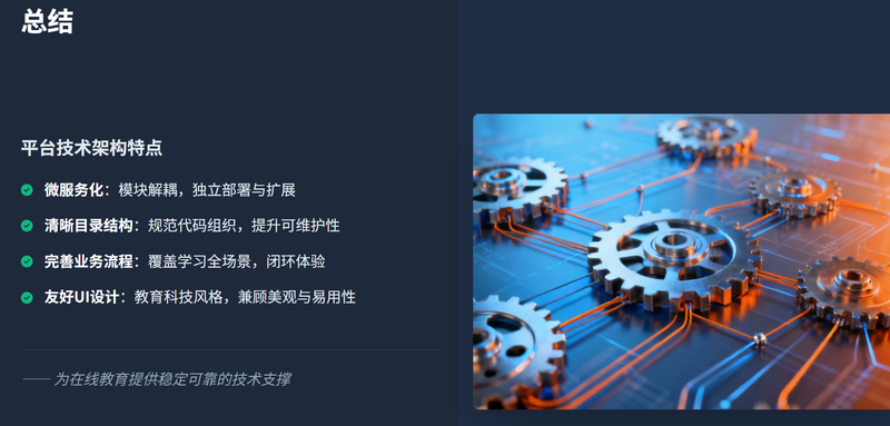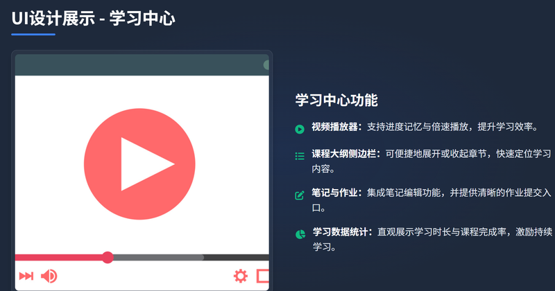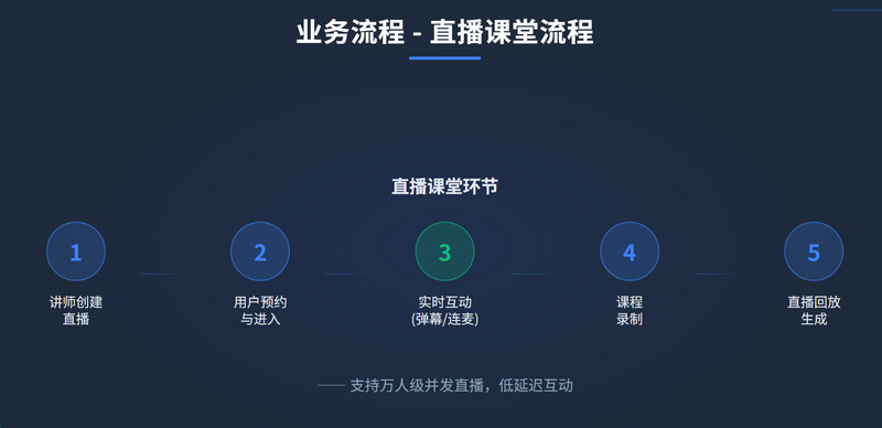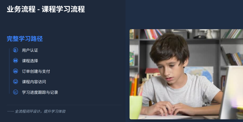 学习服务:视频点播(进度记忆)、直播课堂(连麦互动)、作业提交 / 批改