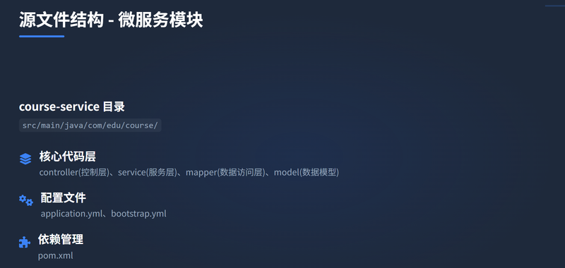 课程服务:课程 CRUD、章节管理、讲师信息、价格套餐(免费 / 付费)