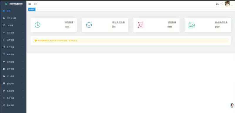 汇总企业运行核心指标,如计划数量、任务数量、完成率等。