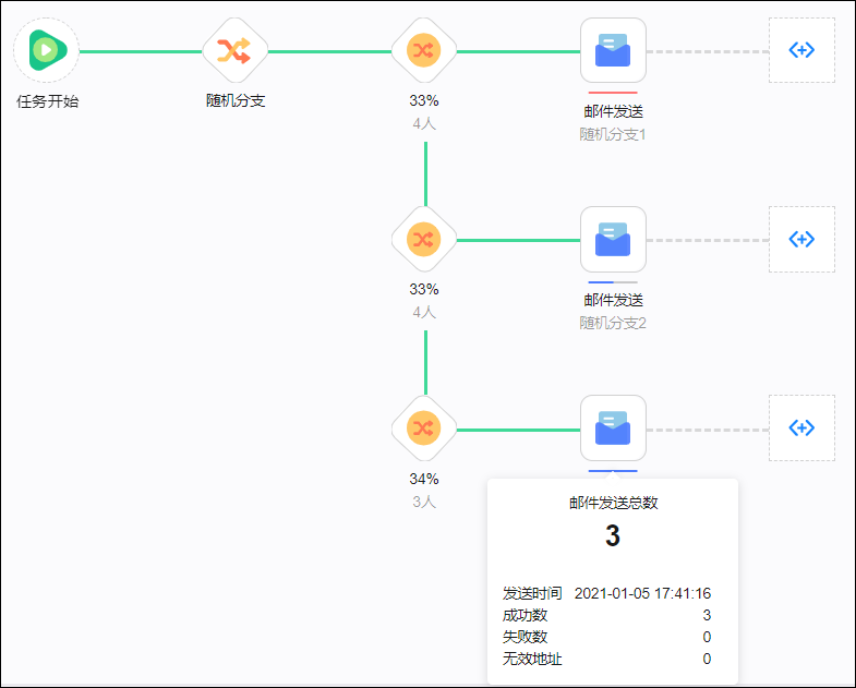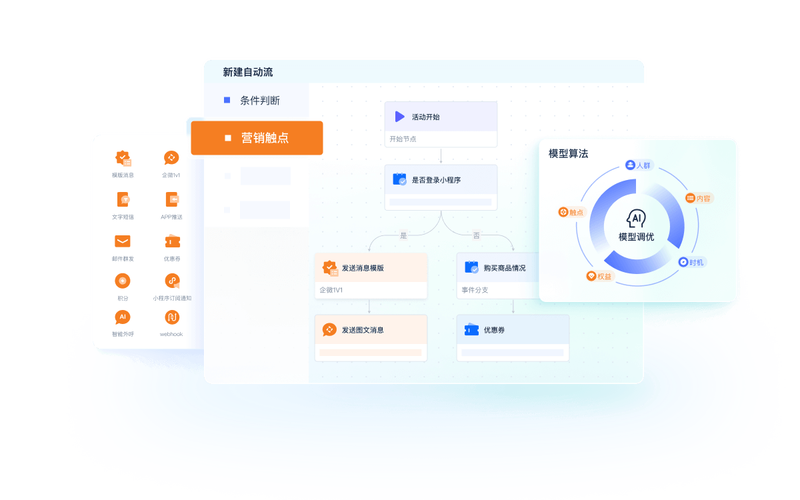 自定义营销流程:可自由拖拽流程节点,并设置每个流程节点的触发条件,及该流程节点的具体动作