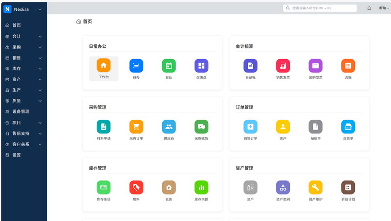 本系统基于 ERPNext 与低代码技术,覆盖家居制造 “采购 - 生产 - 仓储 - 销售 - 财务 - 办公” 全链路,核心功能如下: