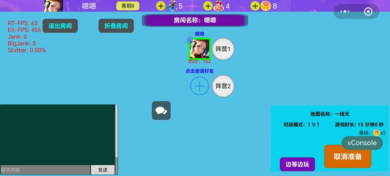2、左上角是用户的头像、积分;中间是1v1匹配、2v2匹配、人机对战按钮;