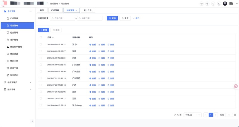 1、基本的数据管理,例如产品管理、地区管理、行业管理、客户管理、工单管理等