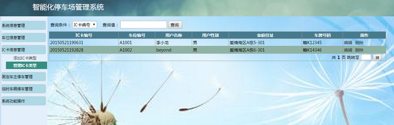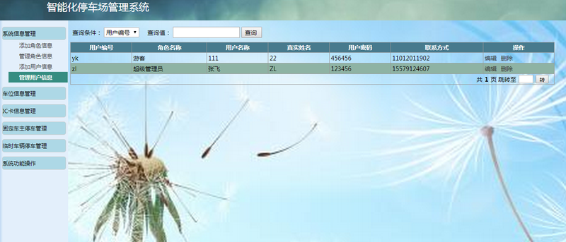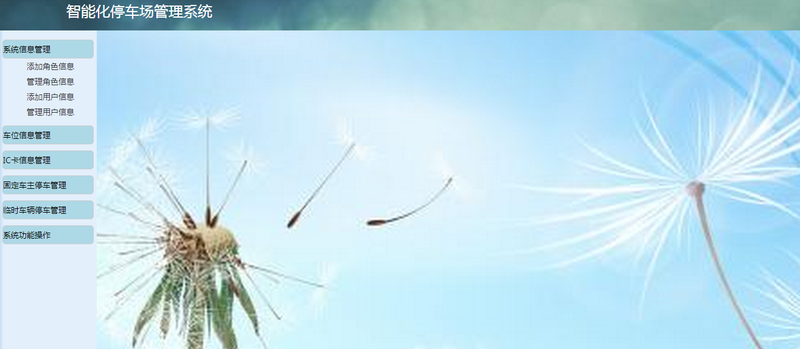 实现车主进出停车场以及相关信息处理的停车场管理系统,其中包含了系统信息管理、车位信息管理、IC卡信息管理、固定车主停车管理、临时车辆信息管理、收费管理、打印管理、系统功能操作等。在系统信息管理中,包括添加角色信息、管理角色信息、添加用户信息、管理用户信息、管理角色信息和管理用户信息模块可以对角色和用户进行查询、编辑和删除;会在其中设置员工的信息和权限等;在车位信息管理中,包括添加车位信息、管理车位信息,管理车位信息模块可以对车主车位信息进行查询、编辑和删除;在IC卡信息管理中,包括添加IC卡类型,管理IC卡类型。管理IC卡信息可以对车主的IC卡信息进行查询、编辑和删除,会对智能刷入卡进行处理,使用户进出更加方便;在固定车主停车管理中,可对车主的停车信息进行查询和删除;在临时车辆信息管理中,可对临时车主的停车信息进行查询和删除;在收费管理中,包括添加收费信息、管理收费信息。可以选择是月用户还是年用户。相应的,管理收费信息可以对车主的费用进行一个收费,可以对车主的收费信息进行查询和删除;在打印管理中,对所需要打印的信息进行打印处理,包括对固定车主和临时车主相关信息进行打印和取票机的打印;在系统功能操作中,可操作主系统,退出或者或者登陆