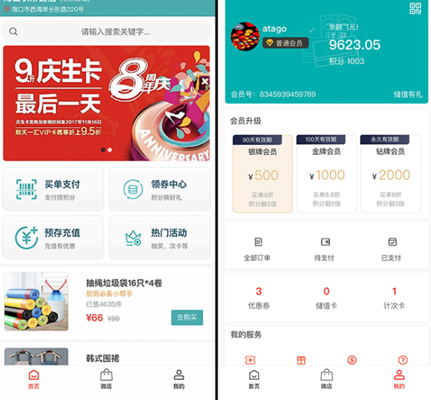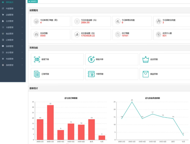 会员管理:包括会员新增、导入、禁用等功能。内容管理:支持焦点图管理、文章管理等。卡券管理:支持电子券、储值卡、实体卡等多种卡券的管理和营销。会员积分:支持会员积分管理、积分操作、积分明细查看等功能。转赠管理:支持卡券转赠记录的管理。短信管理:提供短信营销功能,支持已发送短信列表的查看。系统配置:支持系统管理员权限的配置。店铺管理:支持多店铺模式,方便连锁店铺的管理。核销管理:支持核销人员列表、核销人员审核、核销人员信息编辑等功能。收银代客下单:店员角色可以登录后台,完成代客下单收银的流程。 功能特点 会员运营自动化:商家可以通过日常活动设置,如开卡礼设置、沉睡唤醒等,自动给顾客送优惠券,提升会员运营效率。打通收银系统和会员营销:代客下单收银,支付即成为会员,降低获客成本。会员体系完整化:支持积分兑换、积分转赠、会员等级权益、积分加速、买单折扣等功能。会员卡券齐全:储值卡、电子券、优惠券、集次卡、计次卡、实体卡购买并兑换、会员充值、余额支付等多种卡券功能。多渠道消息推送:支持手机短信、站内弹框消息、微信订阅消息等多种消息推送方式。