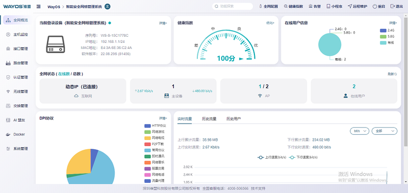 1、全网概览:以图形化方式展示当前登录设备信息、健康指数、在线用户信息、实时流量等数据信息。