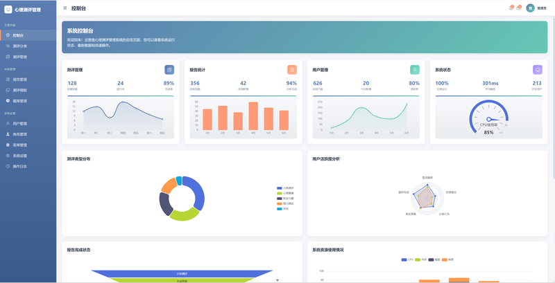 a. 核心数据总览: 实时显示总用户数、新增用户、测评完成数、付费转化率、热门测评TOP5等。