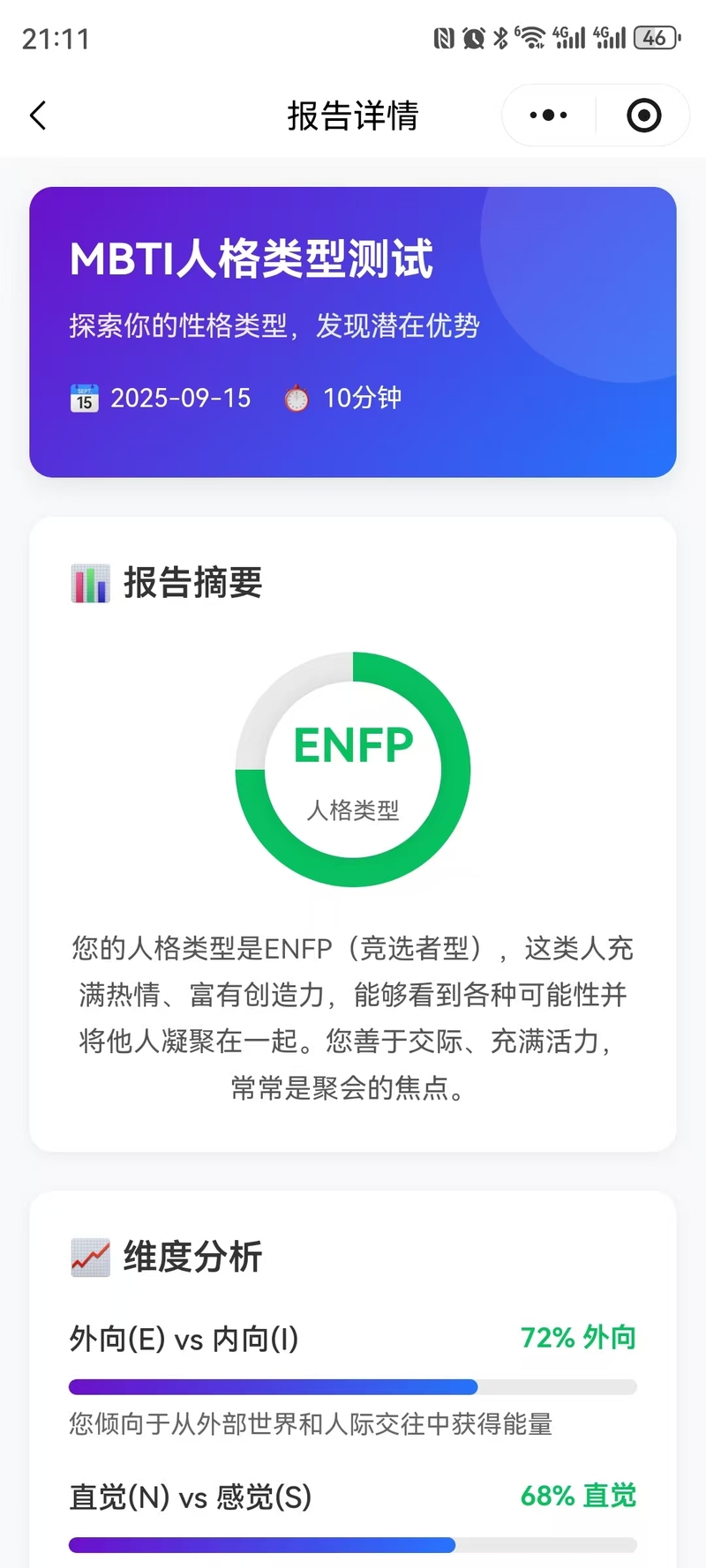 3. 报告模块,用户在答题测评完成,会自动生成对应的报告解析,用户可在报告模块查询得分,以及专业建议。