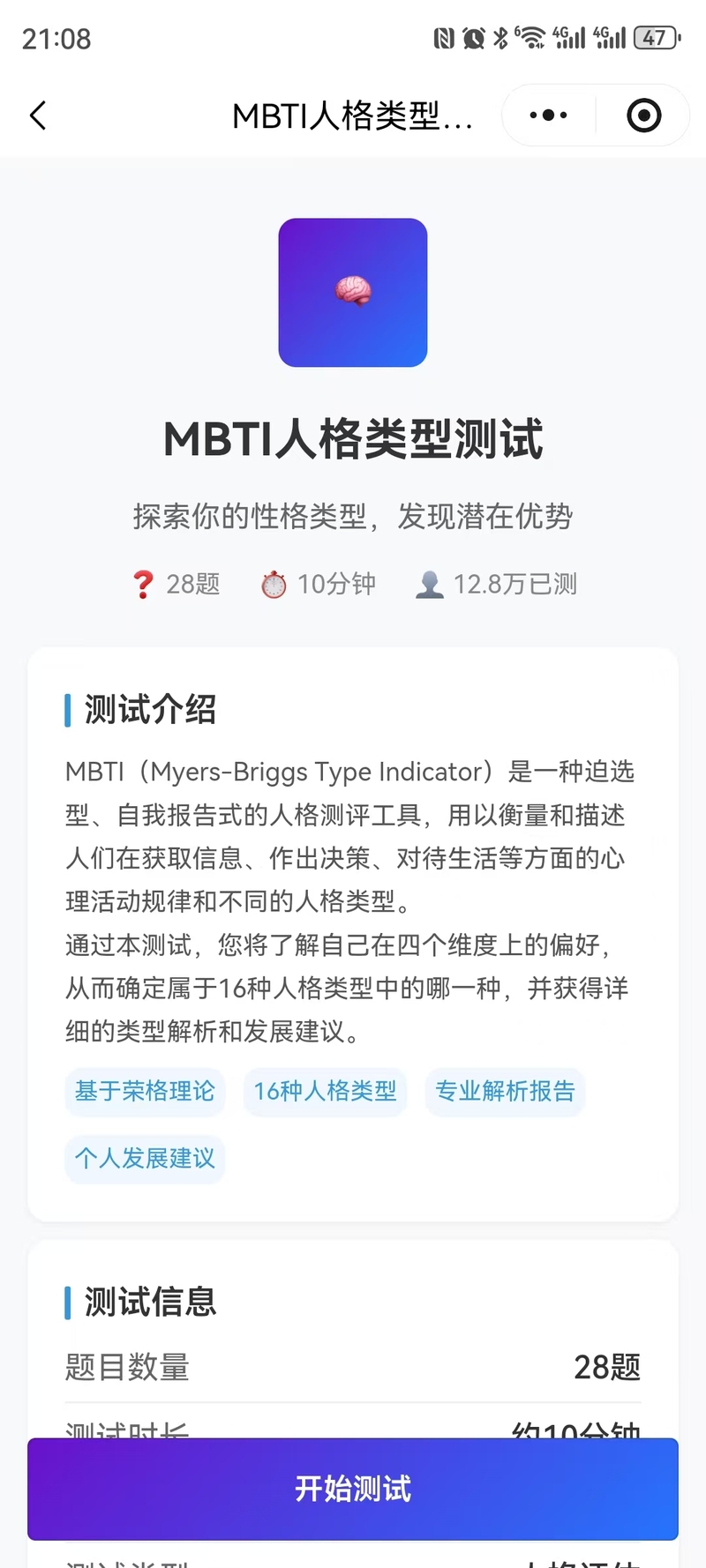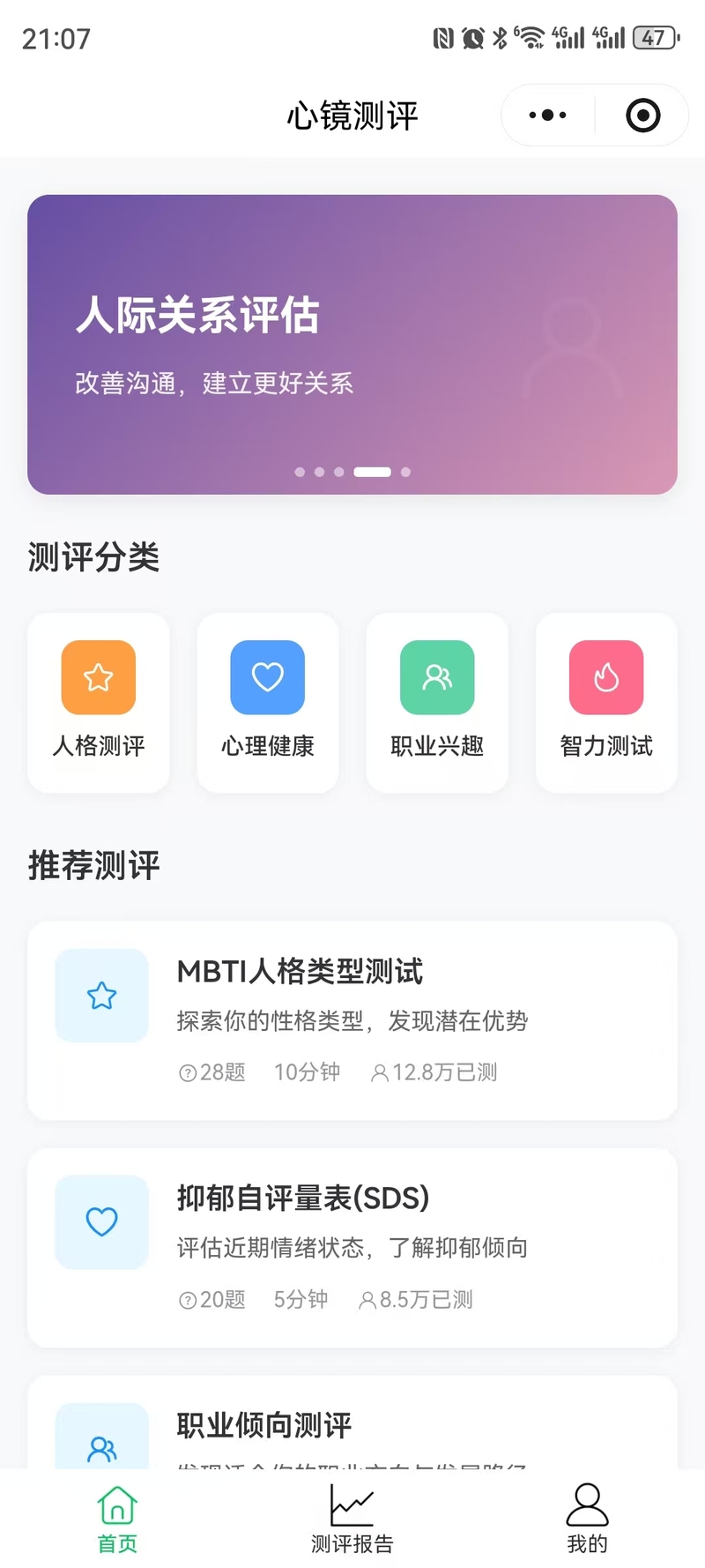 1. 首页模块,提供测评推荐,如“人格测评”、“职业兴趣”、“心理健康”等。