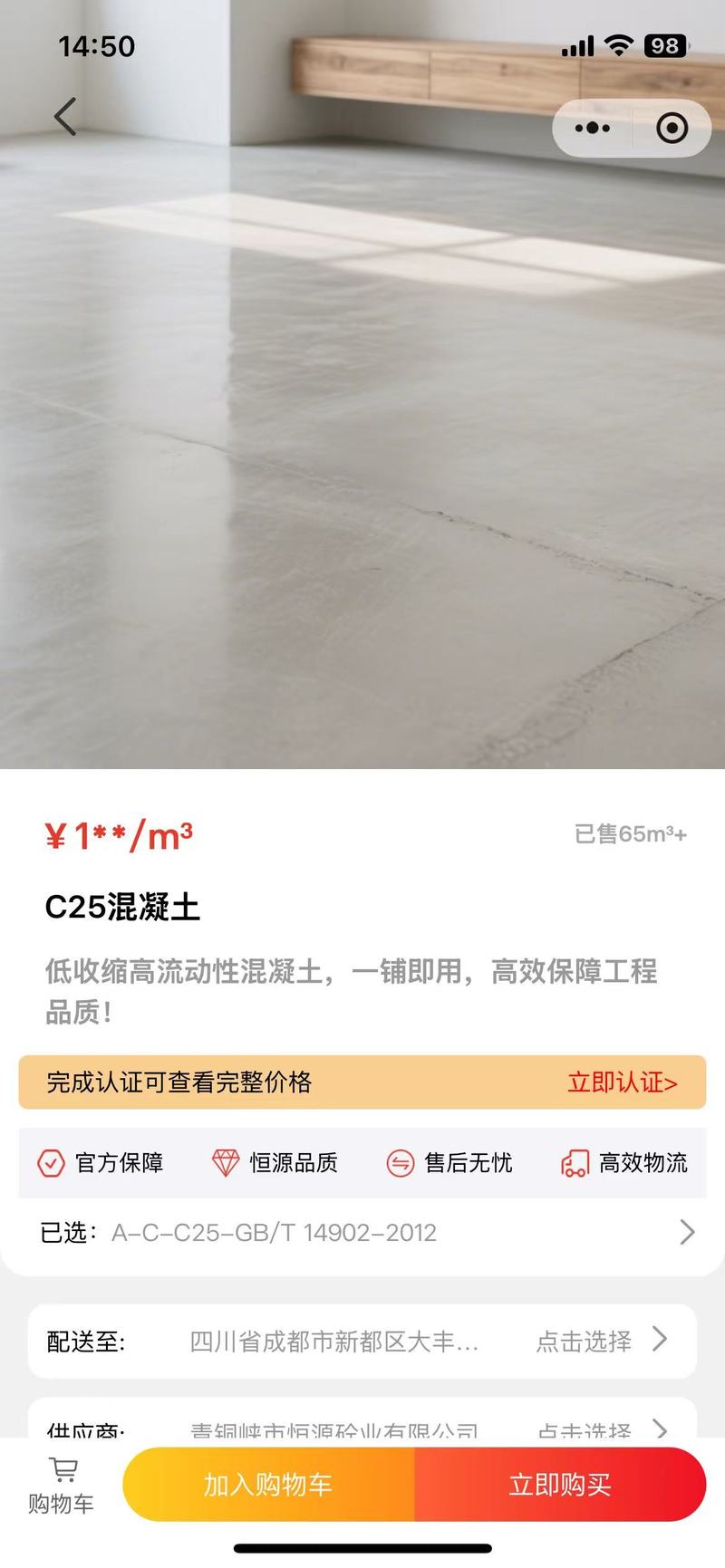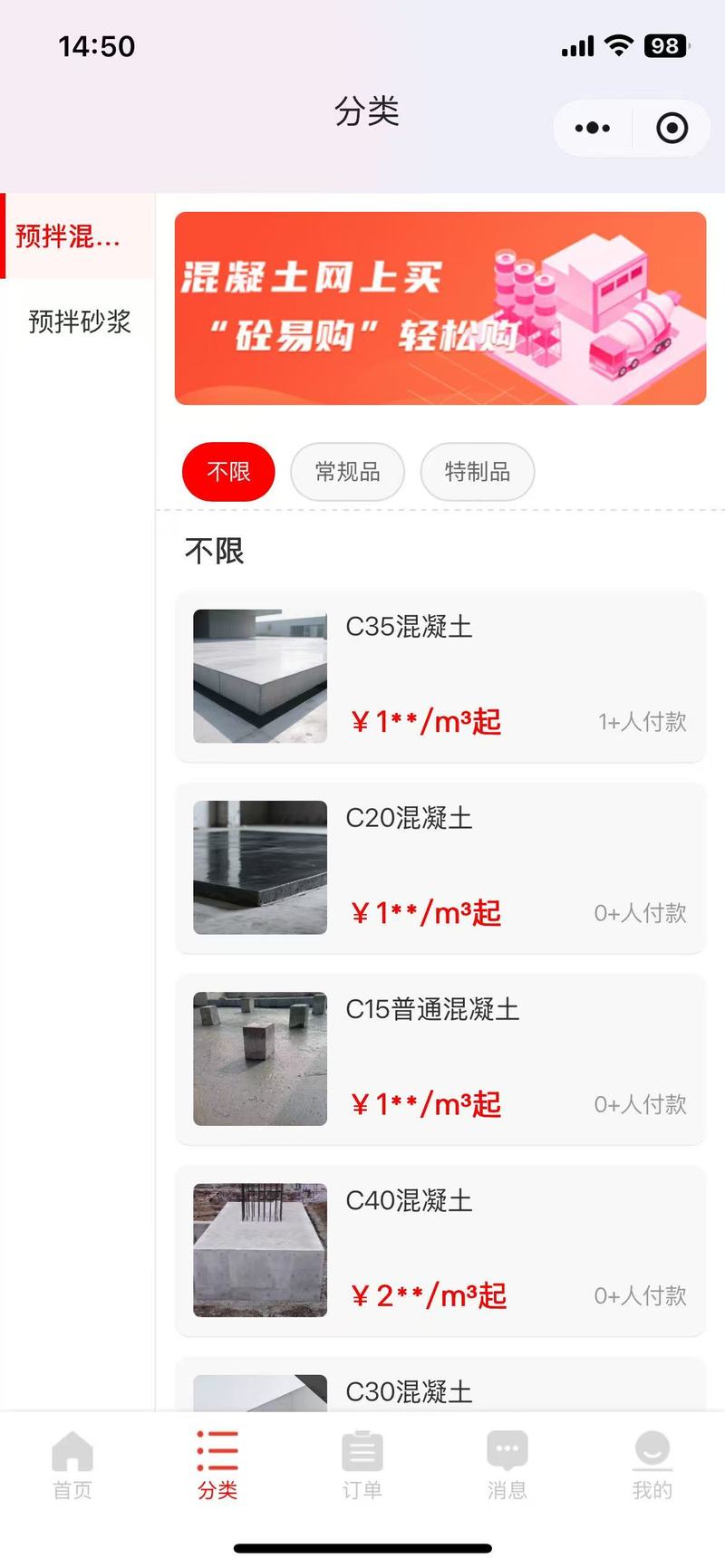 2、用户进行商品选择,然后下单支付,并且可查看当前商砼运输状态