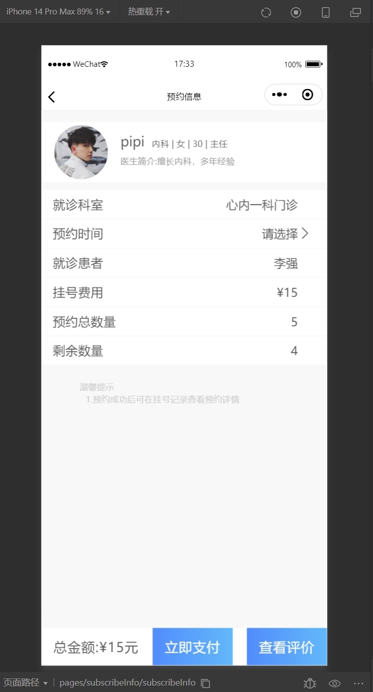 6、用户就诊前一天可以小程序主动提醒就诊以及注意事项。