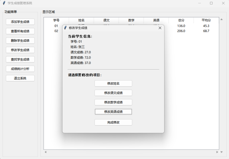 提供选择性修改菜单:姓名、各科成绩、无修改,返回上一级