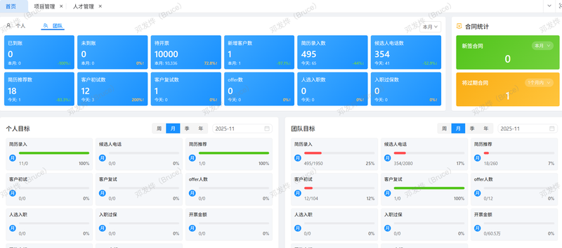 首页统计 人才管理 项目管理 客户管理 KPI管理 在线学习功能 对接了简历自动解析功能 解决了猎头招聘过程了成本问题,档案管理问题,以及客户管理问题。 有这方面需求的可沟通探讨。