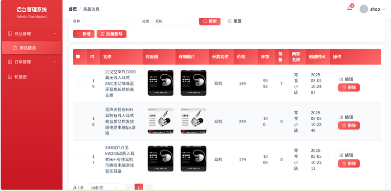 商品管理:商品发布、商品编辑、商品上下架、库存管理、商品搜索、商品列表、商品分类、商品分析、商品浏览、商品详情、商品评价查看
