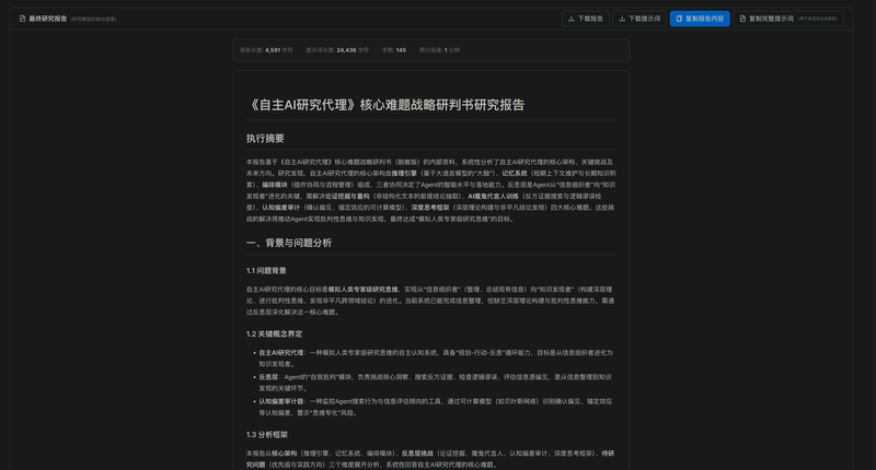 动态研究规划引擎: AI可根据用户问题,结合历史研究上下文,自主地、多轮地生成并迭代研究计划与搜索策略。