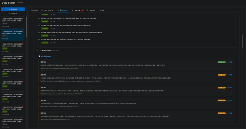健壮的流程控制与持久化: 支持长时间研究任务的暂停、恢复与终止,并具备完整的会话持久化和恢复功能。