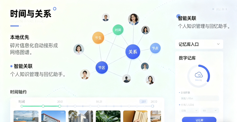 核心理念: 传统的笔记软件(如印象笔记、Notion)擅长管理结构化的知识,但难以捕捉和关联那些零散、感性的个人记忆碎片(如一段对话、一张随手拍的照片、一首歌的触动)。本项目旨在打造一个 “以时间和关系为核心” 的个人数字记忆库。它不仅仅是一个存储工具,更是一个能帮助你主动发现记忆之间深层联系,并智能触发回忆的助手。