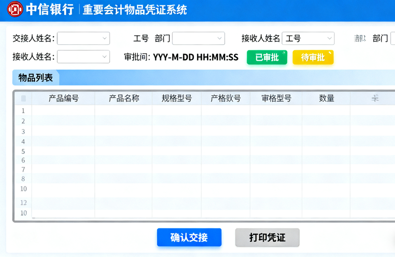 重要会计物品凭证系统主要分为两部分,重要物品和待保管物品。重要物品是对银行网点内 ATM机、金库、库房、保险柜等物品的钥匙、密码、万能钥匙、生物识别码等物品进行处理。待保管物品是针对客户在网点存放的贵重物品、卡折单等物品的登记流转处理。