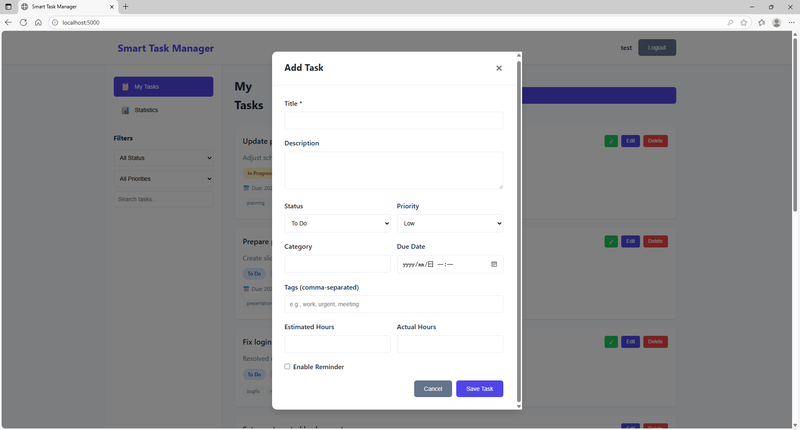 系统包含用户认证(注册/登录)、任务CRUD操作、多维度筛选(状态/优先级/分类)、实时关键词搜索、任务提醒设置、工时记录、数据统计分析等核心功能。提供直观的可视化仪表板,展示任务完成率、状态分布、优先级统计。支持任务标签、截止日期管理,全响应式设计适配移动端。