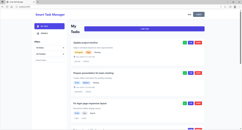 开发了一个完整的任务管理系统,解决团队协作和个人任务跟踪难题。支持任务创建、状态跟踪、优先级管理、实时搜索和数据统计,提高工作效率和项目管理能力。