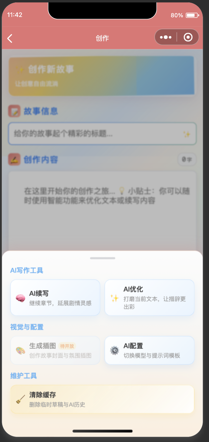 独立开发小程序,目前等待备案上架。TaleWeaver采用前后端分离架构,后端基于Python/FastAPI/PostgreSQL,前端包含Next.js数据看板与微信小程序客户端,亮点是集成多AI服务的智能创作能力和多作者协作功能,同时支持任务徽章系统,实现故事创作全流程管理。
