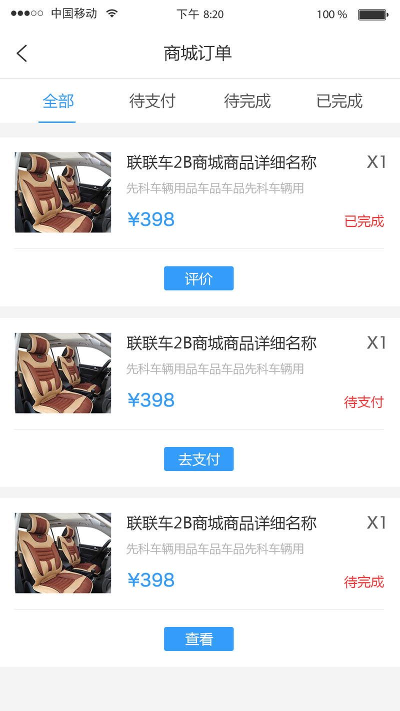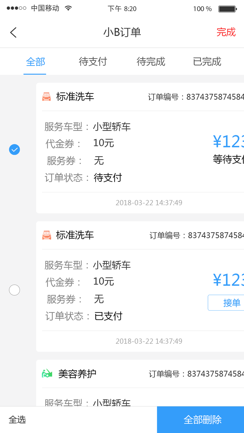 设计了智慧洗车行。功能有:基本信息、订单管理、服务管理、店铺平价、订单统计、店铺服务等功能; 。2.设计了店铺信息。包括:背景图片,指的是店铺照片、企业名称、联系电话、企业地址、企业简介、营业执照(照片附件)3.设计了联联车小B端订单界面。有4个tab标签页:全部、待支付、待完成、已完成。在全部中,实现了每个洗车的订单列表。