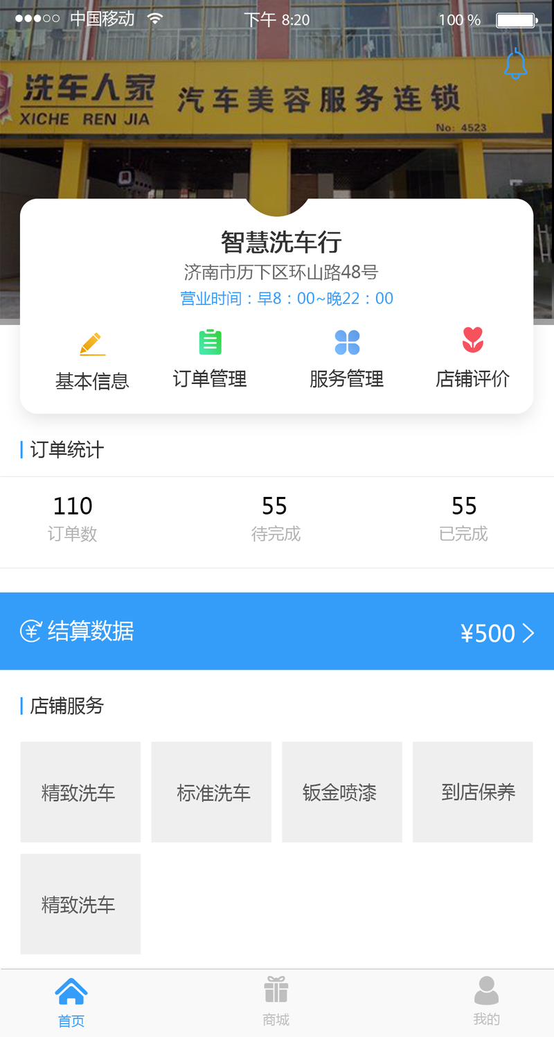 智慧洗车行。功能有:基本信息、订单管理、服务管理、店铺平价、订单统计、店铺服务等功能; 以及设计出了它们的子页面
