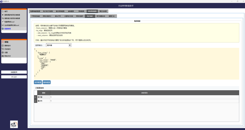 - 功能模块:涵盖省份账单截取配置、关键字字典维护、部制/用电分类/电压等级匹配、特殊倍率与 Sheet 索引管理、行过滤与表头识别规则、自定义表格模板、配置备份恢复以及导入导出等模块。