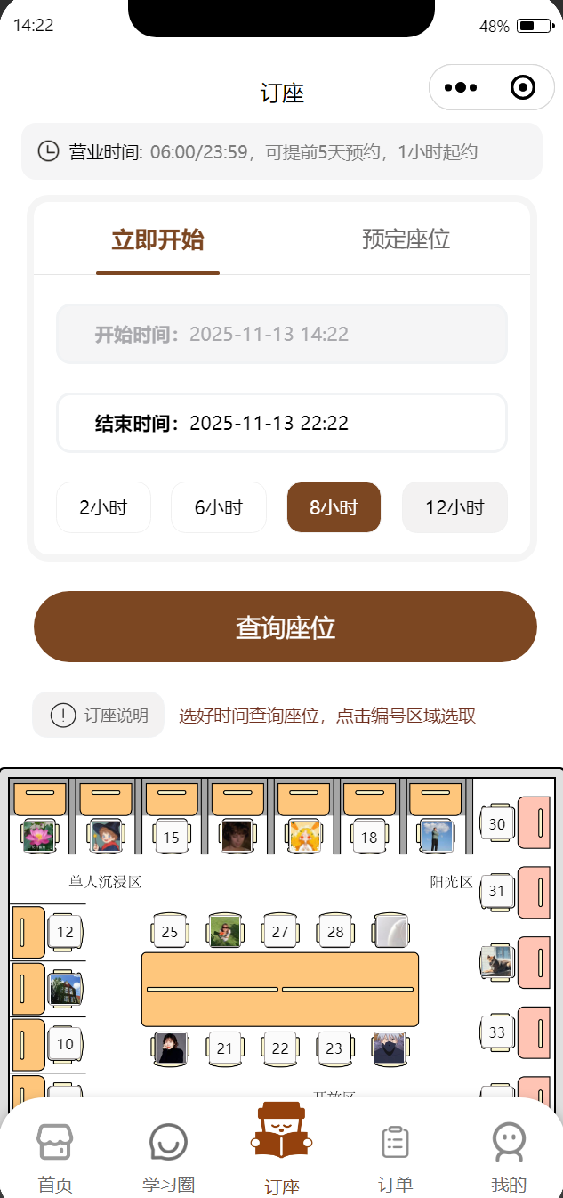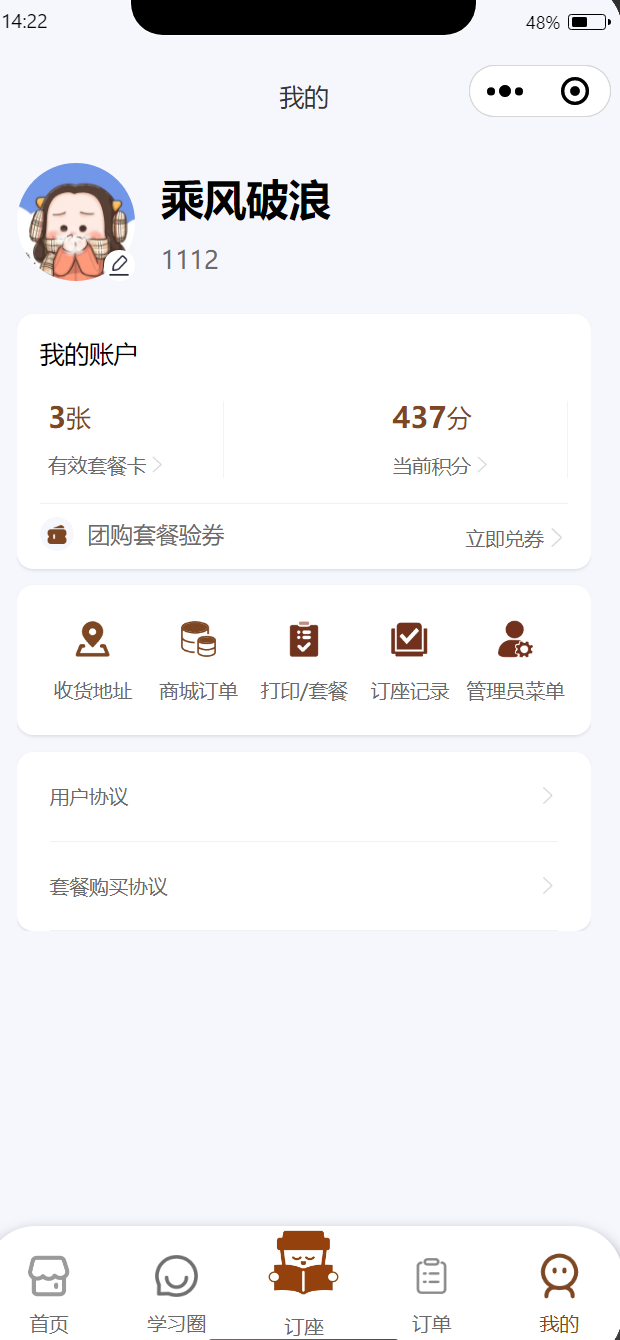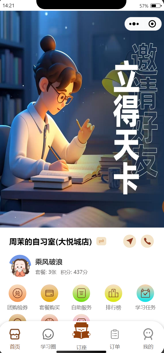 订座、套餐购买、团购核销、远程打印机、硬件控制(开门、座位通电)、积分抽奖、积分商城、学习朋友圈、排行榜、学习任务,为了方便管理员不经常使用电脑所有后台管理操作功能全部开发在了小程序上只不过只要管理员可见