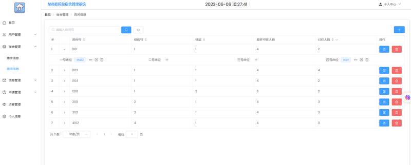 实现难点: 主要难点在于宿舍分配与调寝的业务逻辑,需要确保在并发场景下不会出现床位分配冲突;另一个难点是设计合理的数据库表结构,以高效关联学生、宿舍、楼宇、报修记录等多个实体,并保证数据的一致性。