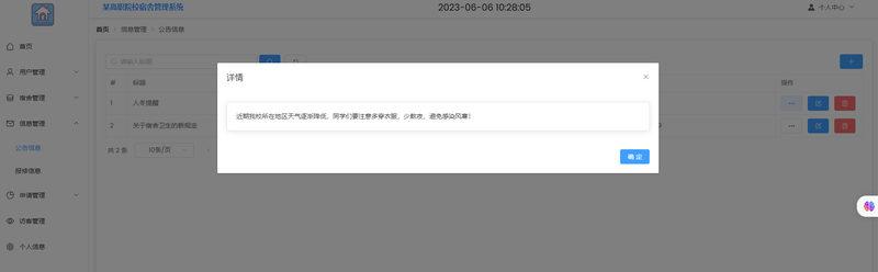 实现亮点: 采用RBAC(基于角色的访问控制) 模型,清晰划分了管理员、宿管、学生三种角色的权限;使用 Vue+ElementUI 实现了现代化、组件化的前端界面,用户体验良好。