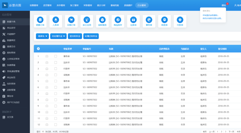 添慧商圈功能包括: 数据字典、商品类型、商品标签、角色管理、快速查看、功能维护。数据看板: 商品统计数据,饼图,柱状图。