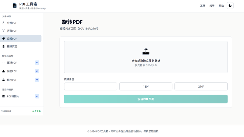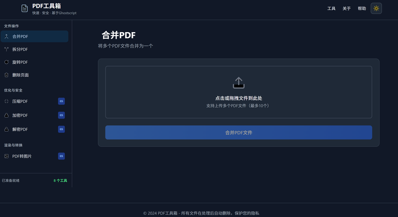 一个功能强大的专业PDF处理工具,基于 Ghostscript 和 pdf-lib 实现。提供现代化Pro Studio工作流界面,支持合并、拆分、压缩、加密、解密、旋转、删除页面和转图片等 8 大核心功能。