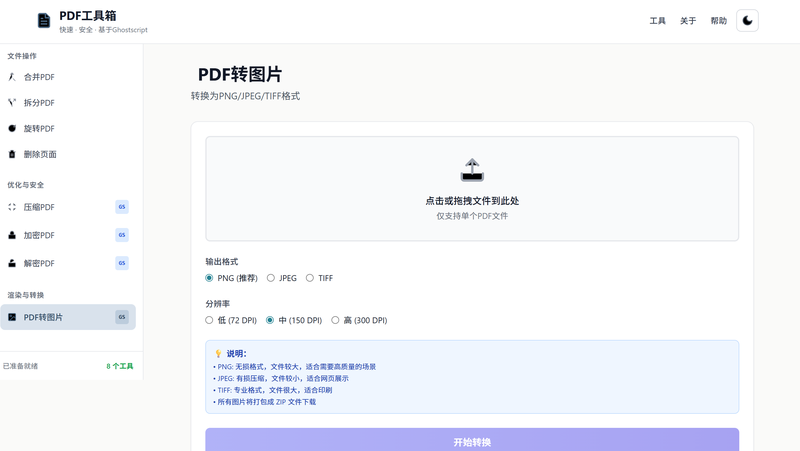 - 🖼️ **PDF转图片** - 转换为 PNG/JPEG/TIFF,支持分辨率和质量调节