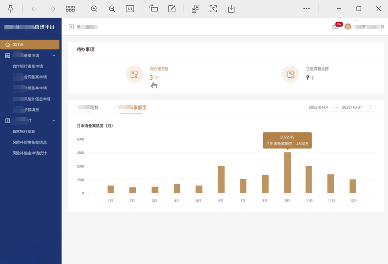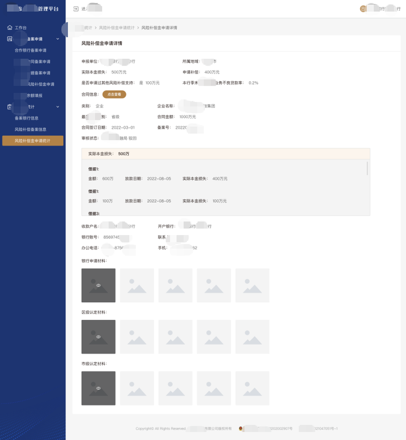 2.项目目的:平台为政府监管单位和金融机构间搭建了统一线上申报审批通道,以标准化流程支撑了信贷风险补偿政策高效落地,缩短审批时间,提升统计准确度,提高政府办公效率。