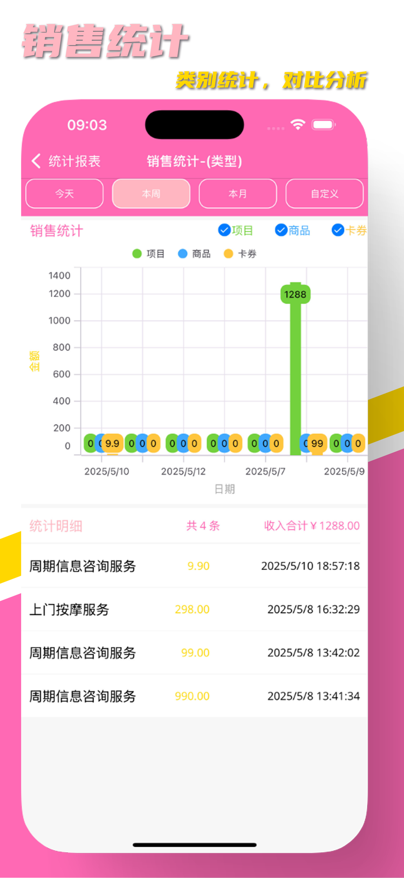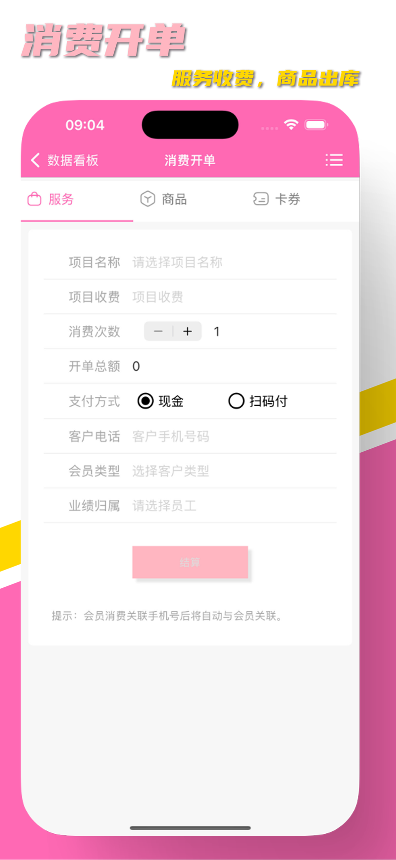3、消费开单。在完成服务项目内容后,可使用该功能,可以选择相应用的服务并收取费用,也可以选择商品销售出库。