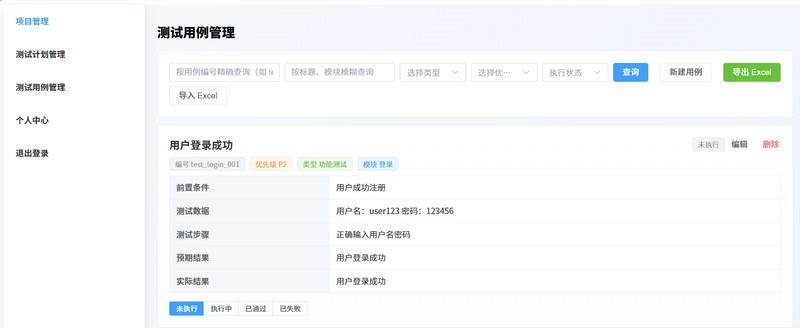 2.测试用例管理,根据你选择的项目,添加你的测试用例,编辑你的用例,可视化按钮更改用例执行状态