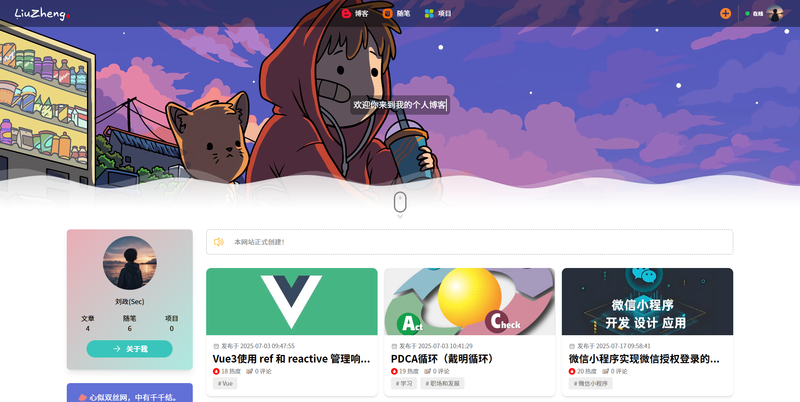 本博客核心围绕“技术沉淀+个人表达”双维度打造,聚焦三大核心功能模块:一是个人技术分享专区,系统梳理前端开发实战经验、问题排查方案、框架应用技巧等干货内容,支持代码块高亮、图文结合展示,助力技术沉淀与同行交流;二是每日心得撰写板块,提供简洁易用的富文本编辑器,可灵活记录生活感悟、学习复盘、行业思考等碎片化内容,支持标签分类、时间轴归档,方便后续回顾与梳理;三是前端Vue技术特色呈现,不仅在博客底层架构中深度应用Vue全家桶(Vue 3、Vue Router、Pinia等)实现组件化开发与高效状态管理,还专设Vue技术专栏,详细拆解路由配置、组件封装、响应式原理、工程化实践等核心知识点,搭配案例演示与源码解析。