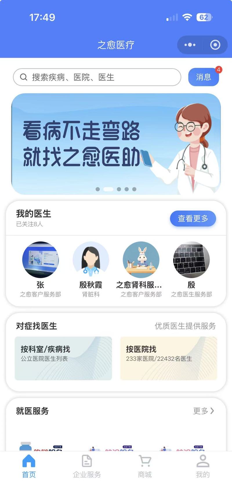 患者端主要为用户提供在线问诊,预约挂号,以及跑腿服务;