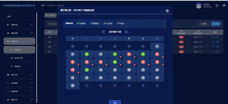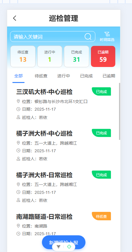巡检管理:包括日常巡检、中心巡检、预警巡检,日常巡检则有后台配置的定时任务,生成的巡检任务,对桥梁或隧道进行日常的巡检勘察。