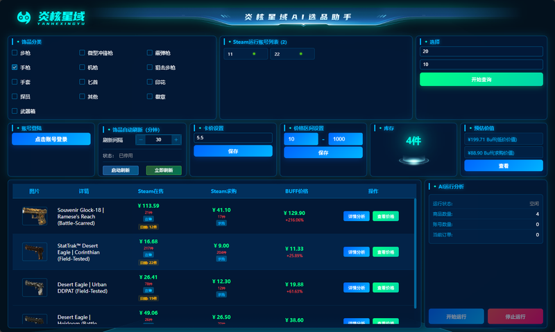 1. 选品阶段:用户配置筛选条件(价格12元、利润率15%、销量≥500),系统自动爬取Buff商品数据,分析价格走势(近7天最低价),计算利润空间,输出shuju.json文件包含所有符合条件的商品。