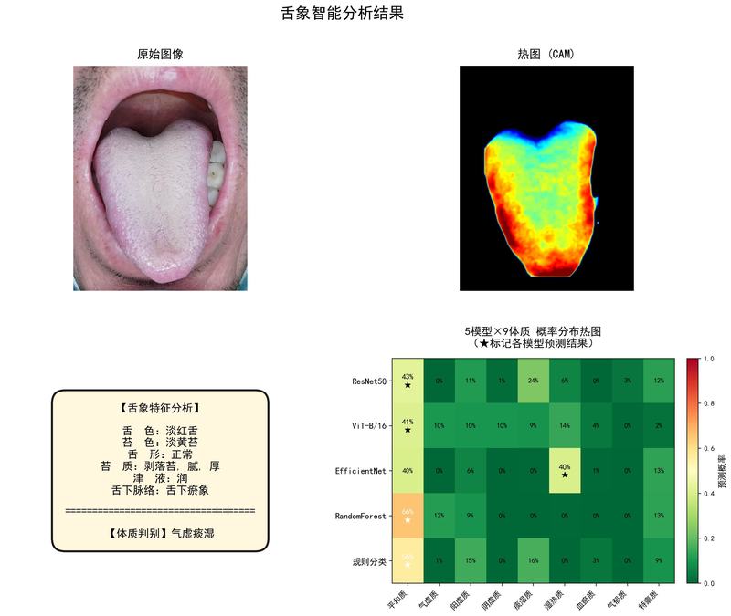 体质判别输出:支持气虚痰湿、气阴两虚等多种体质类型的精准分类,并输出置信度评分