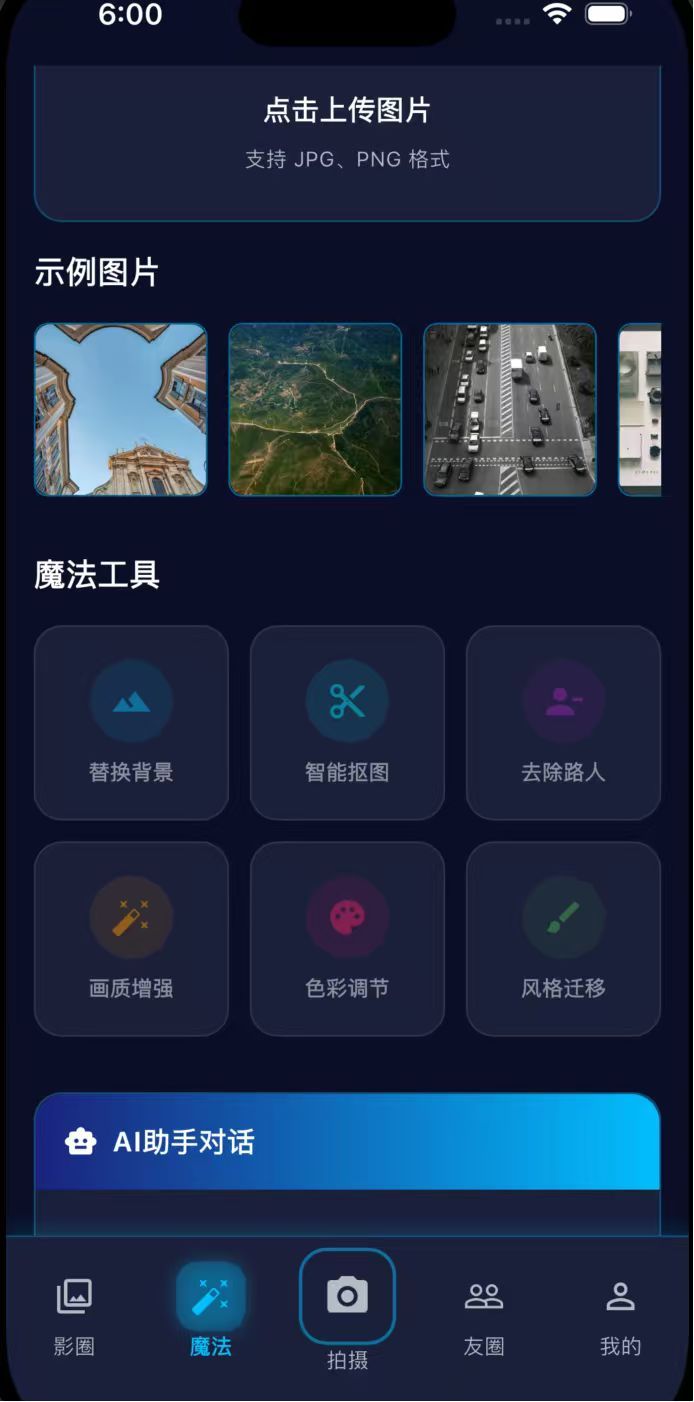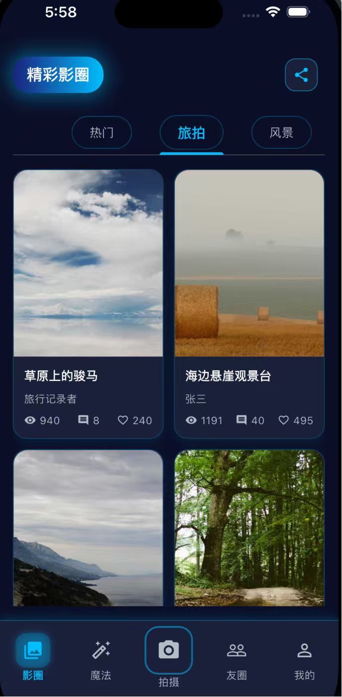 项目中有分享圈,图片魔法又换,ai拍摄,交友圈,个人中心