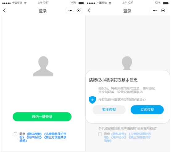授权页面需展示《隐私政策》《儿童隐私保护声明》《用户协议》,明确告知用户授权范围;