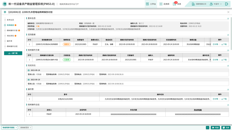 检修全流程模块:以检修计划为主要业务对象,将关联的现场勘察记录、检修方案、操作票、工作票、人员到岗到位情况、检修总结等业务数据进行全流程显示。