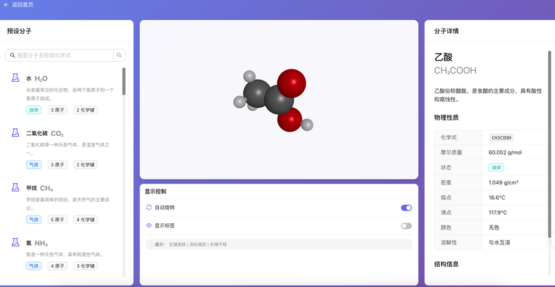 2. 3D分子模型可视化:使用Three.js技术实现分子结构的3D渲染,支持旋转、缩放、平移交互,内置20+常见分子库(H2O、CO2、CH4等),展示原子、化学键、分子构型,帮助学生直观理解分子结构。