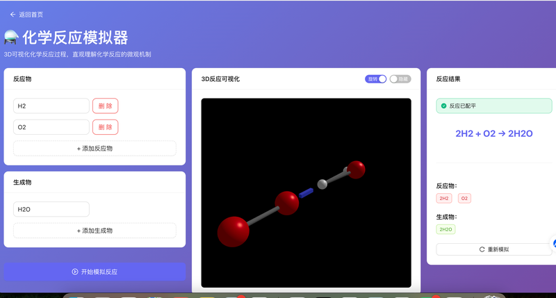 8. 化学反应模拟器:3D可视化化学反应过程,使用Three.js展示反应物和生成物的分子结构,支持方程式自动配平,动画展示反应过程。